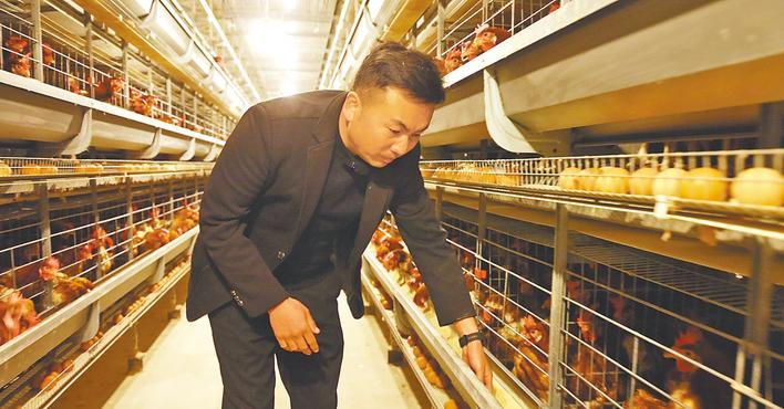 于志忠检查智能蛋鸡工厂内部。 (湖北日报记者 张山东 供图)